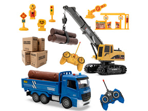リモコン式クレーン1台とプルバック式ダンプトラック1台のセットです。遊びながら建設車両への興味を広げ、想像力や創造力を自然に育むことができます。 -